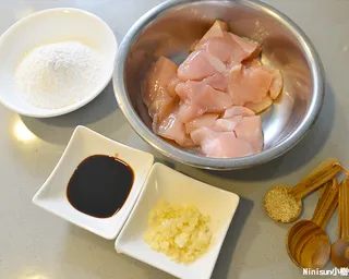 Mix the soy paste, sugar, and minced garlic with the chicken, then marinate it in the refrigerator for 30 minutes. - 把醃好的雞肉包上樹薯粉再放10分鐘,讓雞肉的粉潮濕,這樣能讓雞肉更酥脆好吃!把腌好的鸡肉包上树薯粉再放10分钟,让鸡肉的粉潮湿,这样能让鸡肉更酥脆好吃!